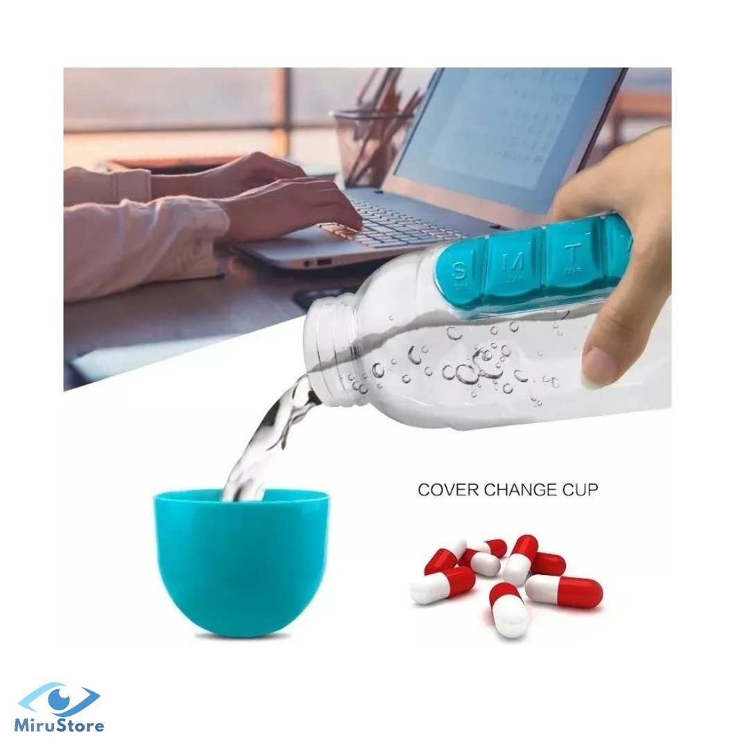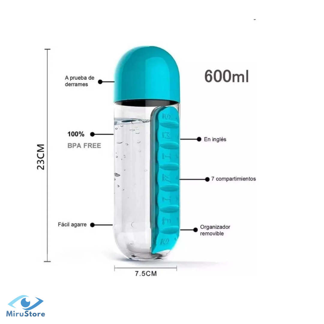 Botella 600ml + pastillero de 7 días + vaso integrado.