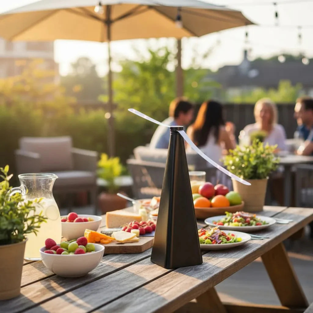 Este Ventilador Repelente de Moscas crea un escudo invisible que mantiene alejados los insectos mientras tú disfrutas la comida y la compañía.